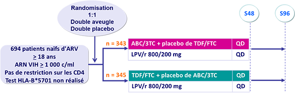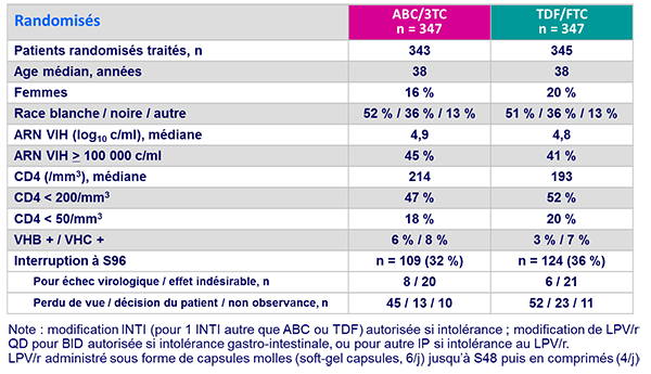 - ABC/3TC et TDF/FTC, chacun en association à LPV/r QD, ont le même taux d’efficacité comme traitement antirétroviral initial