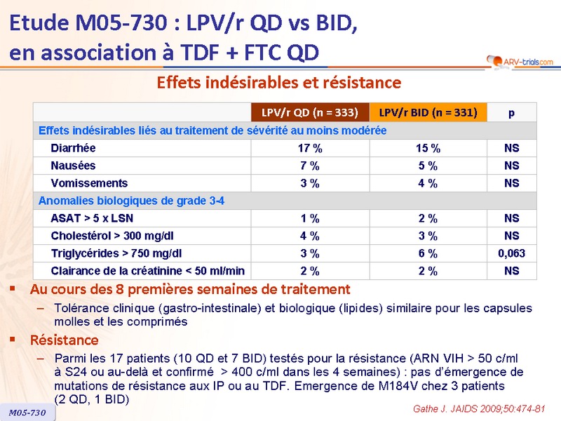 - Parmi les 17 patients (10 QD et 7 BID) testés pour la résistance (ARN VIH > 50 c/ml à S24 ou au-delà et confirmé > 400 c/ml dans les 4 semaines) : pas d’émergence de mutations de résistance aux IP ou au TDF. Emergence de M184V chez 3 patients (2 QD, 1 BID)