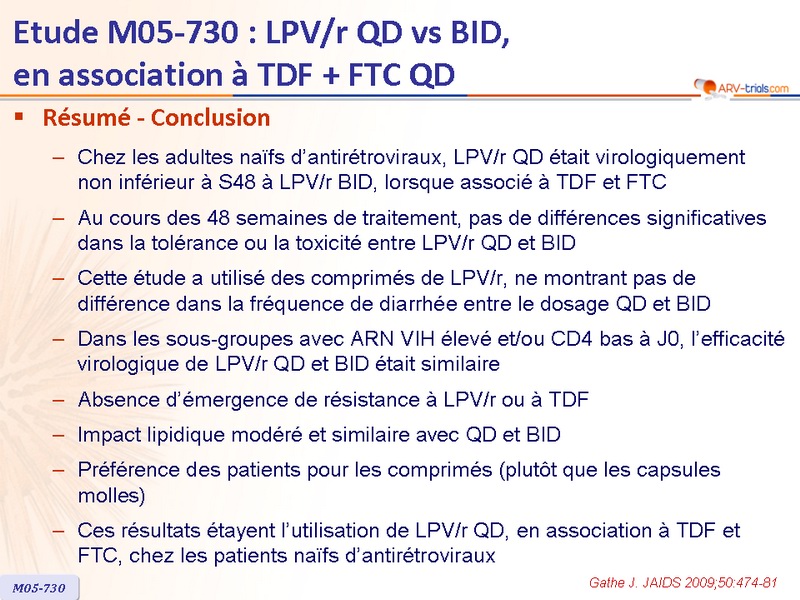 - Ces résultats étayent l’utilisation de LPV/r QD, en association à TDF et FTC, chez les patients naïfs d’antirétroviraux