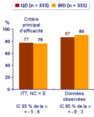 - Augmentation moyenne des CD4 à S48 : 186/mm3 (QD) vs 198/mm3 (BID) (p = 0,32)