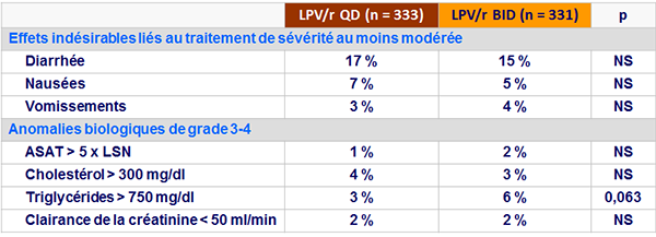 - Au cours des 48 semaines de traitement, pas de différences significatives dans la tolérance ou la toxicité entre LPV/r QD et BID