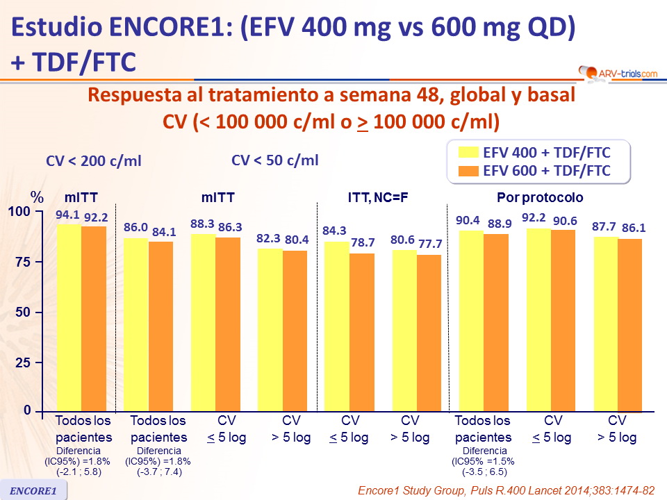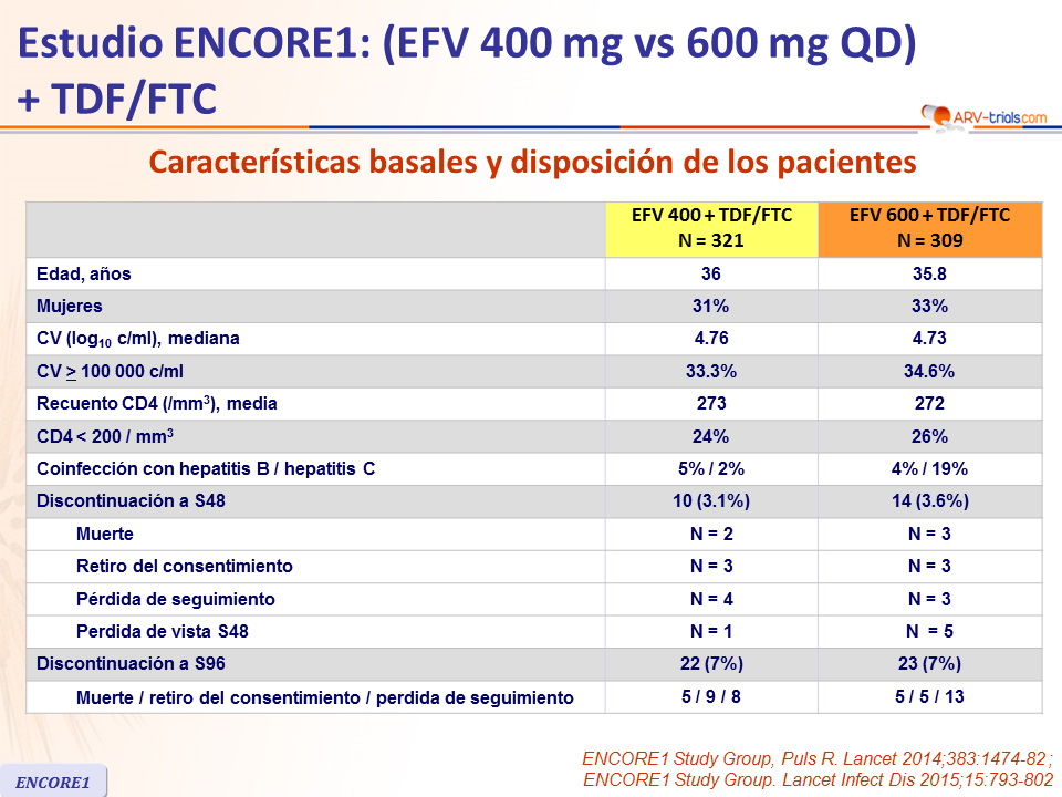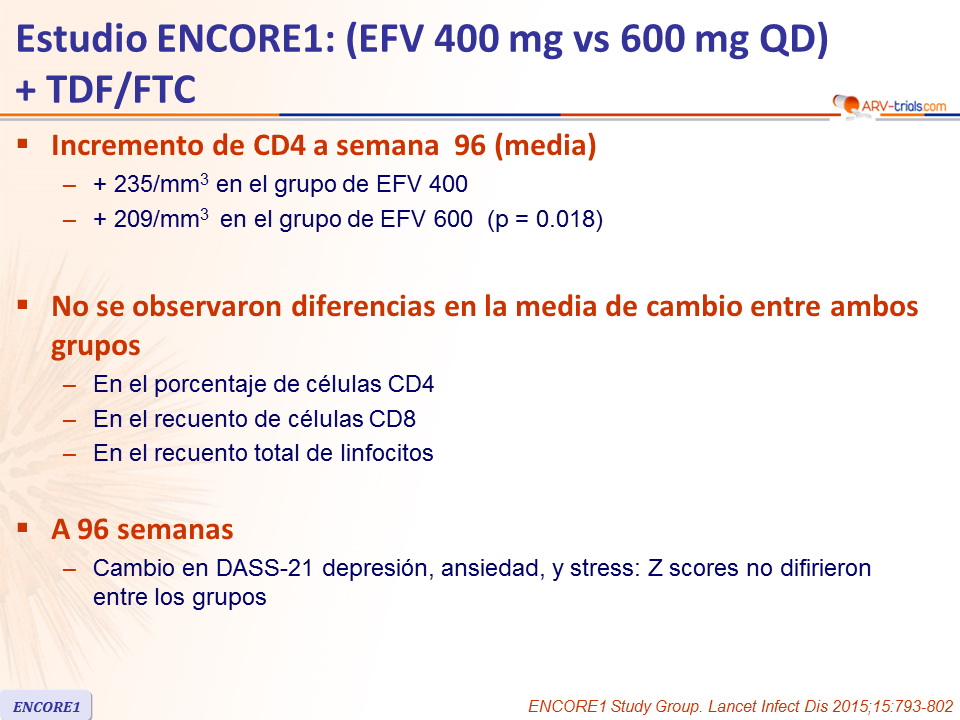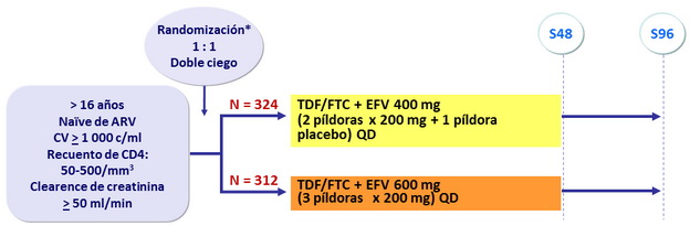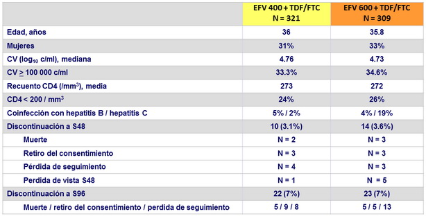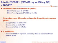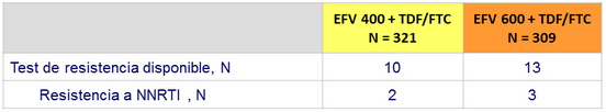 - La reducción de la dosis de EFV a 400 mg QD es no inferior a la dosis estándar de 600 mg QD, cuando es combinada con TDF/FTC durante 48 semanas en pacientes adultos naïve de tratamiento con infección por HIV-1