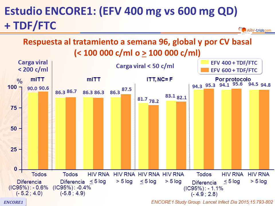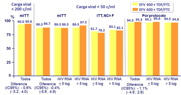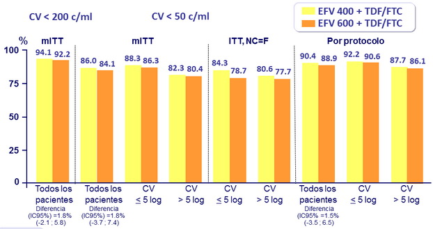 - No inferioridad de EFV 400 mg a S48: % CV < 200 c/mL análisis por intención de tratar (todos los pacientes que recibieron al menos una dosis de la droga en estudio y al menos una visita de seguimiento). Nivel de significancia: 5% margen inferior de IC95% de dos colas para la diferencia= -10%, poder= 90%