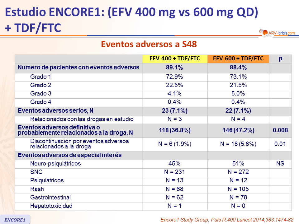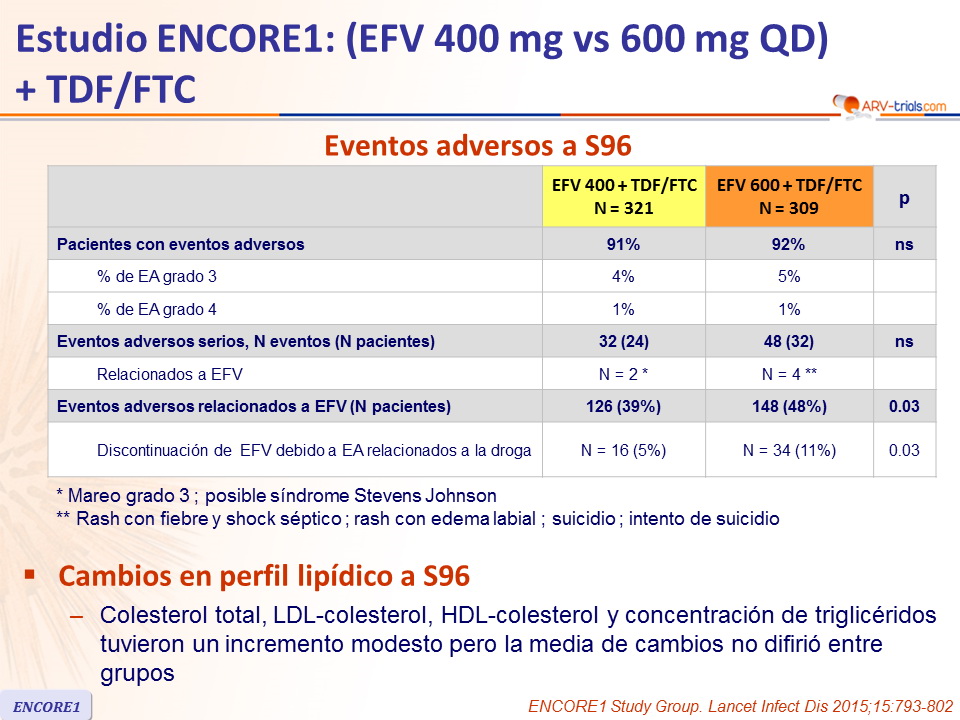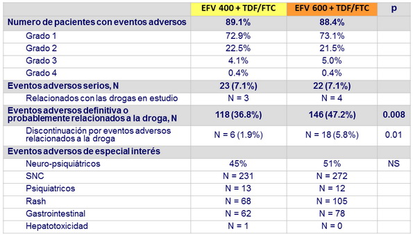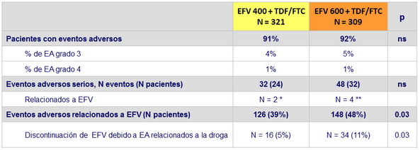 - Sin embargo, los eventos adversos relacionados a la droga fueron mas frecuentes con EFV 600 mg que con 400 mg, y la discontinuación debida