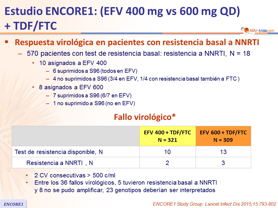 - Entre los 36 fallos virológicos, 5 tuvieron resistencia basal a NNRTI