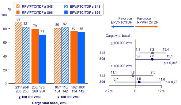 - RPV/FTC/TDF fue superior (estadísticamente significativo) en eficacia en pacientes con CV basal