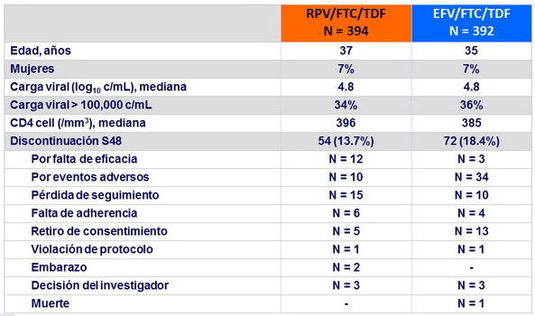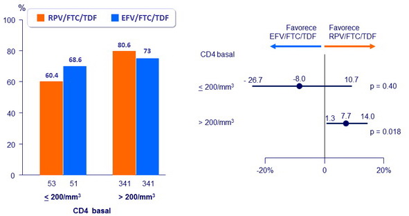Incremento de CD4/mm3 a S 48 : + 200 RPV/FTC/TDF vs + 191 EFV/FTC/TDF(mediana)