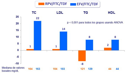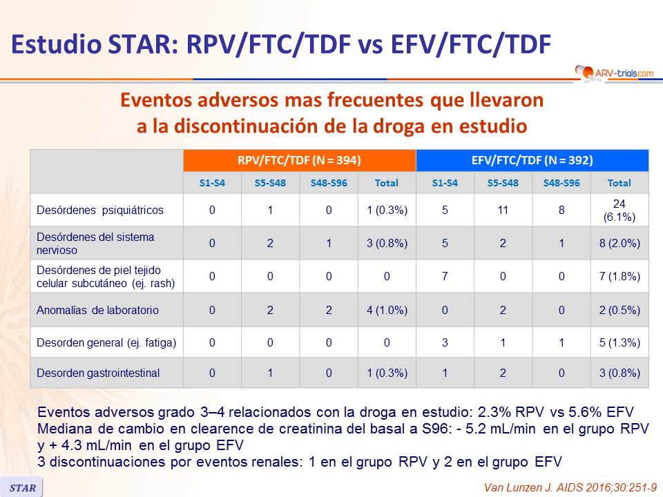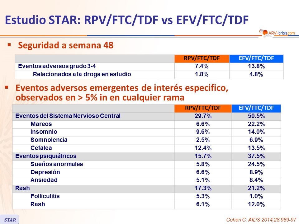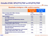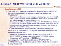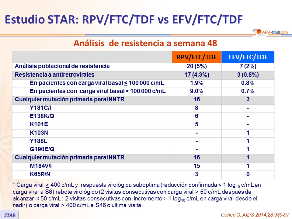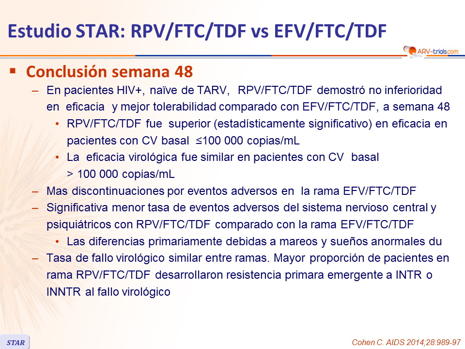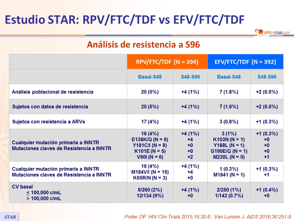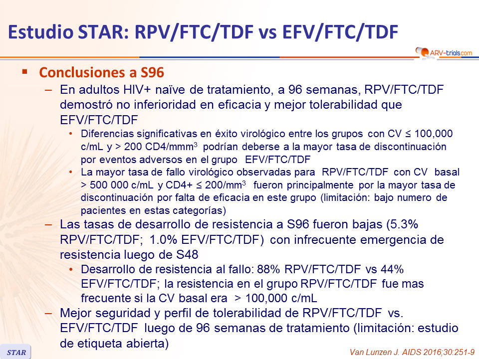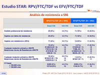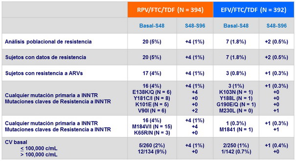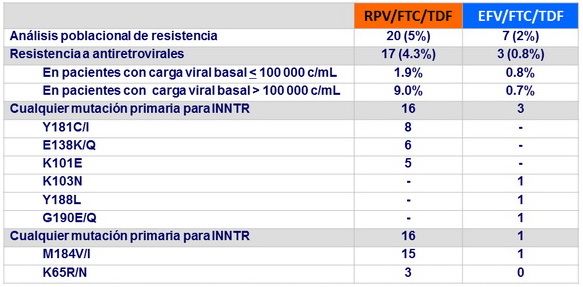- Desarrollo de resistencia al fallo: 88% RPV/FTC/TDF vs 44% EFV/FTC/TDF; la resistencia en el grupo RPV/FTC/TDF fue mas frecuente si la CV basal era > 100,000 c/mL
