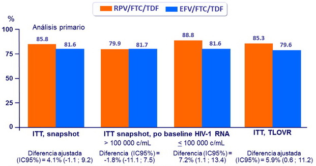 - No inferioridad de RPV/FTC/TDF a S48: % carga viral < 50 c/mL por intención de tratar, análisis snapshot (nivel de significancia de 2.5%, margen inferior del IC97.5% para la diferencia= -12%, poder= 95%)