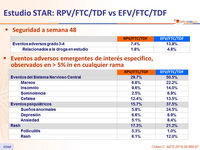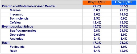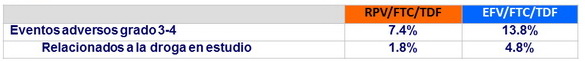 - Significativa menor tasa de eventos adversos del sistema nervioso central y psiquiátricos con RPV/FTC/TDF comparado con la rama EFV/FTC/TDF