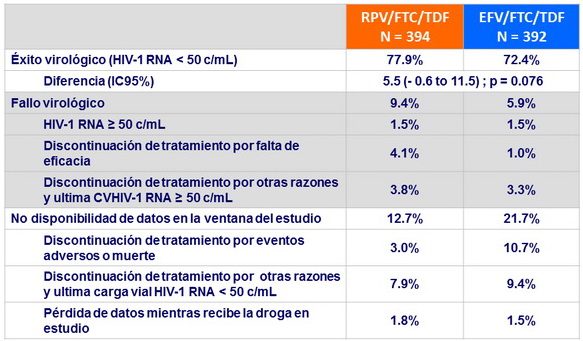 - En pacientes HIV+, naïve de TARV, RPV/FTC/TDF demostró no inferioridad en eficacia y mejor tolerabilidad comparado con EFV/FTC/TDF, a semana 48