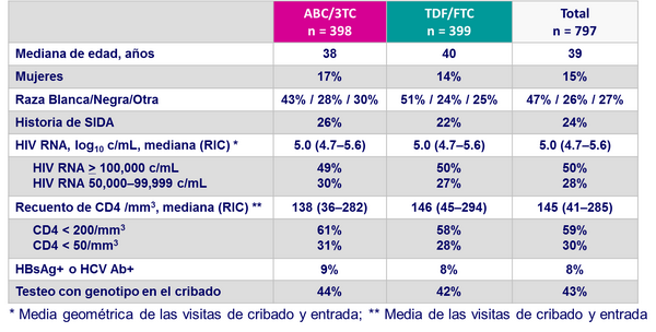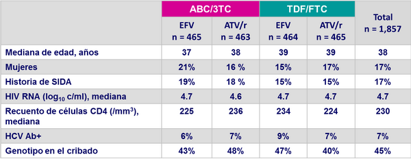 - Criterios de inclusión: infección por HIV-1, > 16 años, < 7 días de terapia antirretroviral previa, valores de laboratorio aceptables