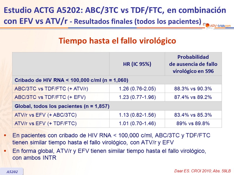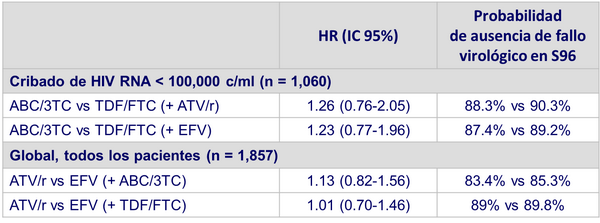 - En pacientes con cribado de HIV RNA < 100,000 c/ml, ABC/3TC y TDF/FTC tienen similar tiempo hasta el fallo virológico, con ATV/r y EFV