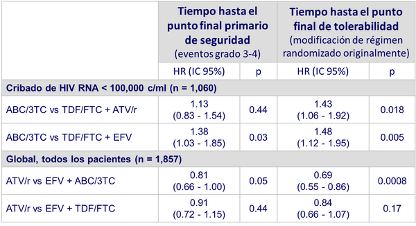 - Menor tiempo hasta modificación con ATV/r y EFV (diferencia impulsada por reacciones de hipersensibilidad sospechadas en ramas de ABC/3TC)