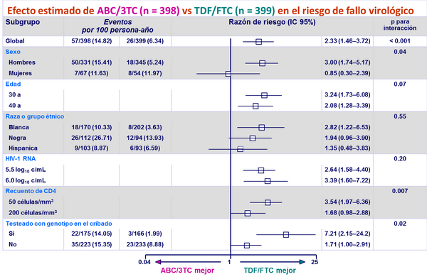 Efecto estimado de ABC/3TC (n = 398) vs TDF/FTC (n = 399) en el riesgo de fallo virológico