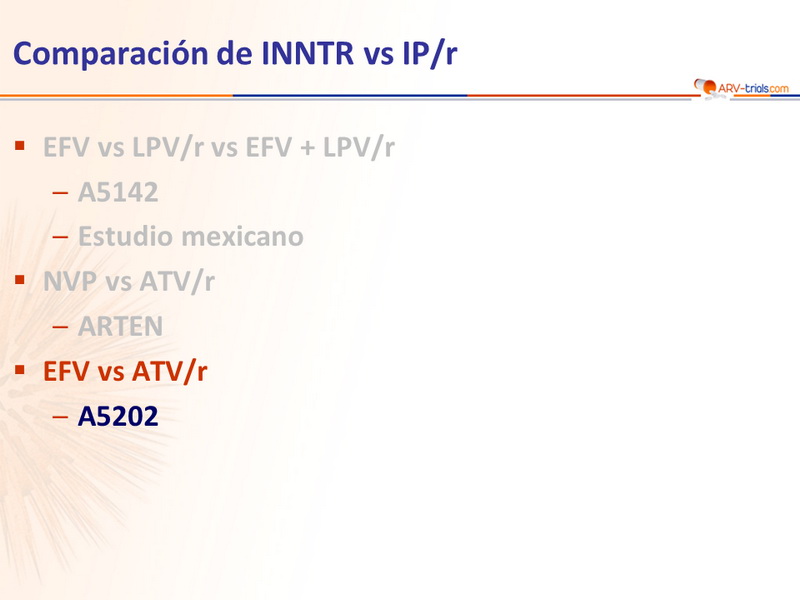 - En forma global, ATV/r y EFV tienen similar tiempo hasta el fallo virológico, con ambos INTR