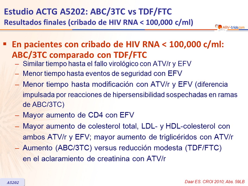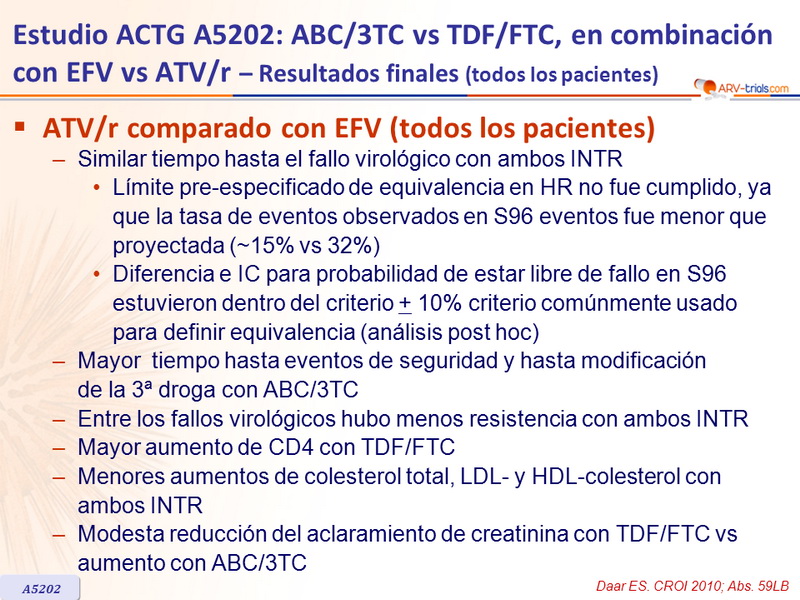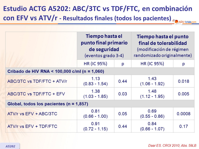 Artículo original : N Engl J Med. 2009 Dec 3;361(23):2230-40 - PE Sax, CROI 2010. Abs. 59LB - ES Daar