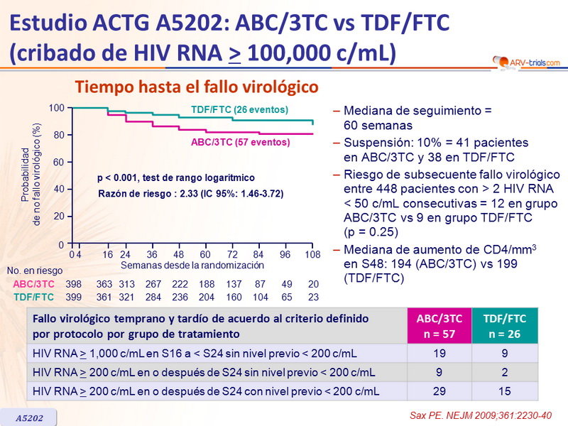 - Riesgo de subsecuente fallo virológico entre 448 pacientes con > 2 HIV RNA < 50 c/mL consecutivas = 12 en grupo ABC/3TC vs 9 en grupo TDF/FTC (p = 0.25)