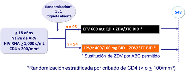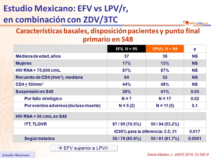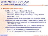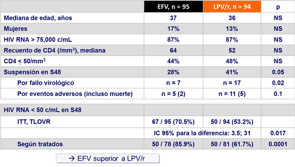 - En esta población naïve de antirretrovirales con infección por HIV muy avanzada con una mediana de CD4 cercana a 50/mm3, EFV fue virologicamente superior a LPV/r BID, combinado con ZDV/3TC