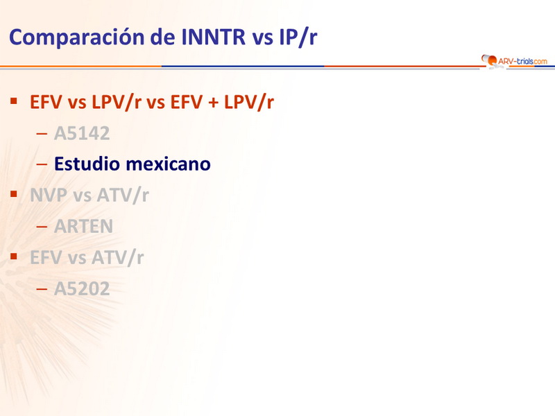- Superioridad de EFV fue debida a una mayor tasa de fallo virológico y de suspensiones por eventos adversos en el grupo LPV/r