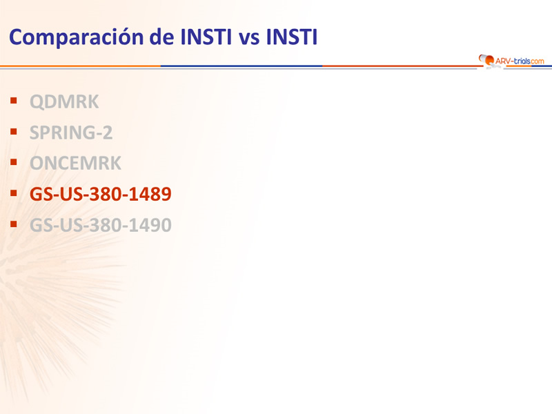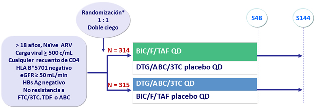 * La randomización fue estratificada por carga viral (≤ 100 000 c/mL , 100 000-4000 000 c/mL o > 100 000 c/mL), CD4 (< 50/mm3, 50-199/mm3 o ≥ 200/mm3) al screening y región geográfica (USA vs no-USA)