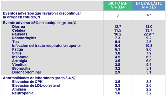 - Las nauseas fueron reportadas significativamente en forma más frecuente en pacientes tratados con DTG/ABC/3TC (p < 0.001)