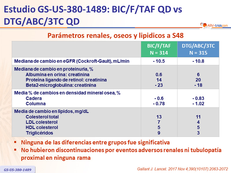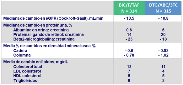 - Los cambios respecto al basal en densidad mineral ósea, parámetros lipídicos y marcadores renales fueron comparables entre ambas ramas de tratamiento