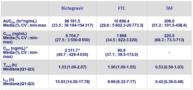 Parámetros farmacocinéticos (estado estable) de BIC/F/TAF (N = 17)