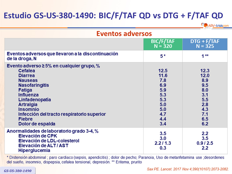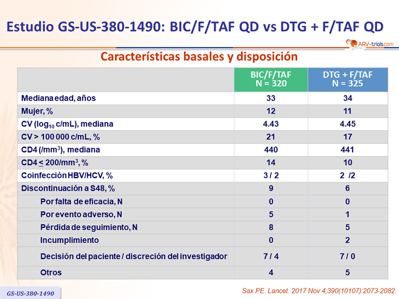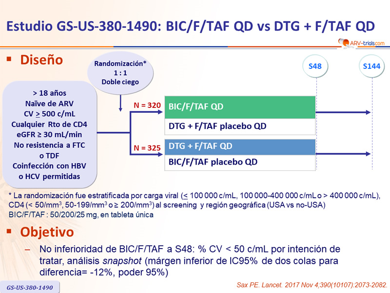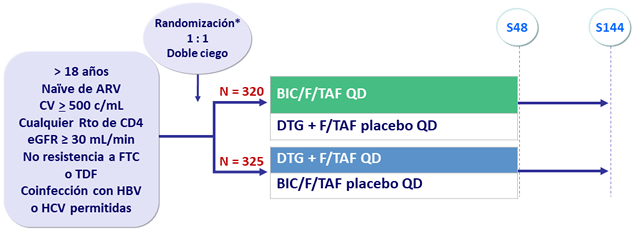 La randomización fue estratificada por carga viral (≤ 100 000 c/mL, 100 000-400 000 c/mL o > 400 000 c/mL), CD4 (< 50/mm3, 50-199/mm3 o ≥ 200/mm3) al screening y región geográfica (USA vs no-USA)