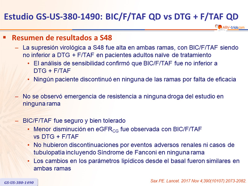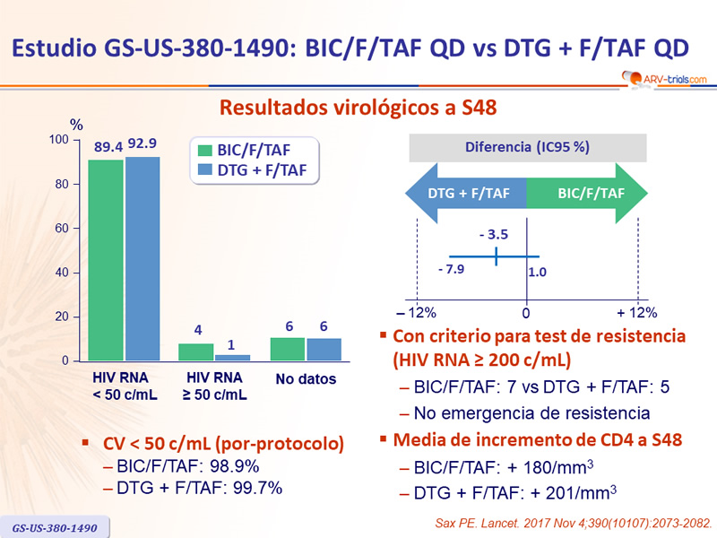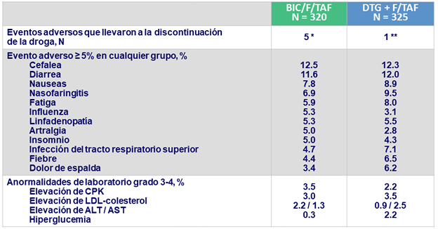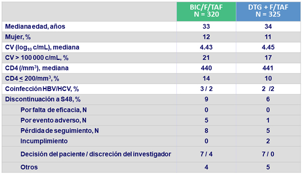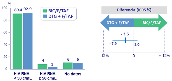 - La supresión virológica a S48 fue alta en ambas ramas, con BIC/F/TAF siendo no inferior a DTG + F/TAF en pacientes adultos naïve de tratamiento