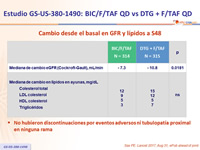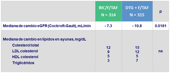 - Menor disminución en eGFRCG fue observada con BIC/F/TAF