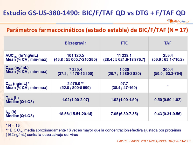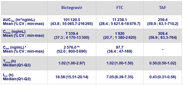Parámetros farmacocinéticos (estado estable) de BIC/F/TAF (N = 17)