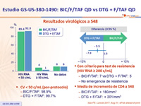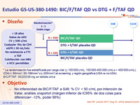 - No inferioridad de BIC/F/TAF a S48: % CV < 50 c/mL por intención de tratar, análisis snapshot (márgen inferior de IC95% de dos colas para diferencia= -12%, poder 95%)