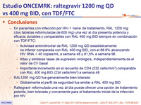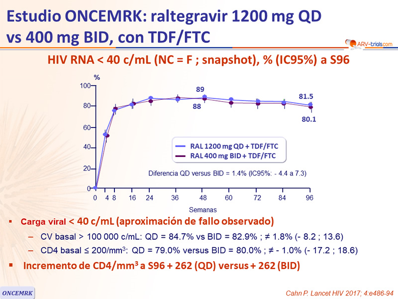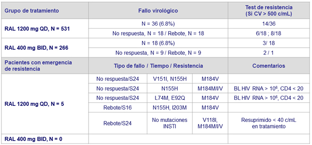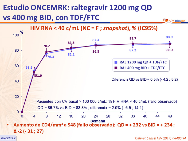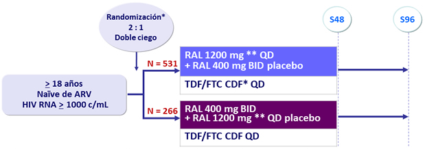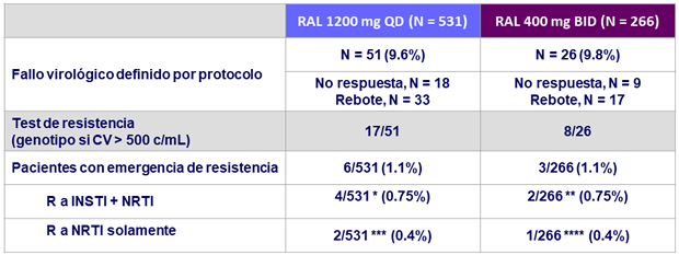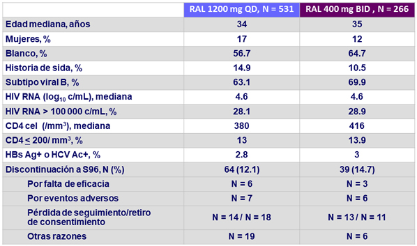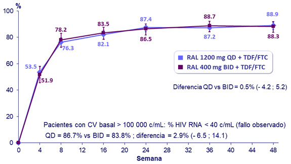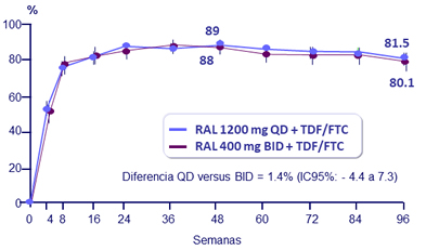 - Actividad antiretroviral de RAL 1200 mg QD estadísticamente no inferior comparada con RAL 400 mg BID, con el 88% alcanzando HIV RNA < 40 copias/ mL a semana 48
