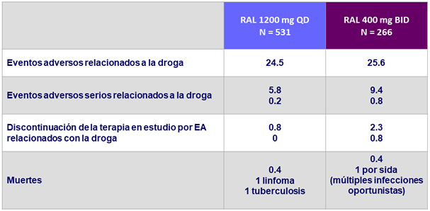 - Globalmente el perfil de seguridad fue similar a RAL 400 mg BID