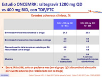 - Importante incremento en el recuento de CD4 (232 cells /mm 3 ) comparable con RAL 400 mg BID (234 cells /mm 3 ) a semana 48