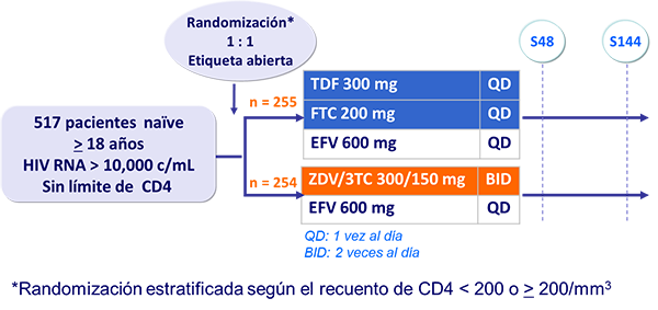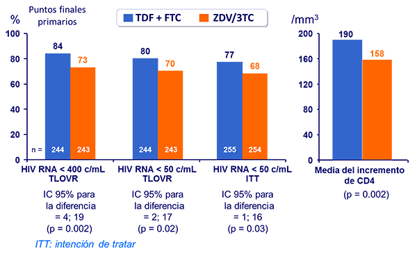 - No inferioridad de TDF + FTC + EFV vs ZDV/3TC + EFV en semana 48: % HIV RNA < 400 c/mL, algoritmo TLOVR* (margen inferior del IC 95% para la diferencia = -13%, poder del 85%)