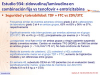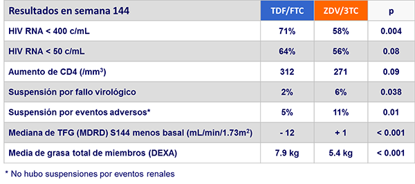 - Significativamente más interrupciones por eventos adversos en el grupo ZDV/3TC: 9% vs 4% (p = 0.02); principalmente por anemia (n = 14 vs 0)