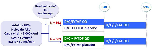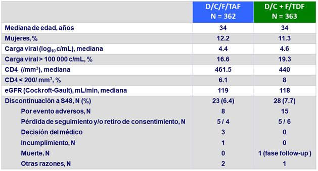 - No inferioridad de E/C/F/TAF a S48: % CV < 50 c/ mL por intención de tratar, análisis snapshot (margen inferior de IC95% para la diferencia = -10%)