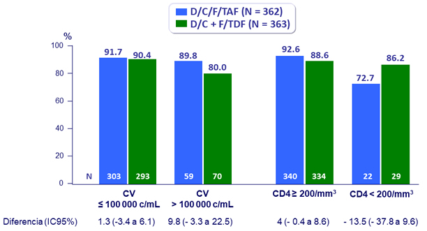 - A semana 48, D/C/F/TAF resultó en una alta tasa de supresión virológica en pacientes naïve de tratamiento (91.4% ; FDA snapshot ) que fue no inferior a DRV/C + F/TDF (88.4%)