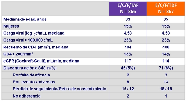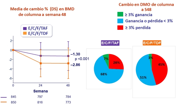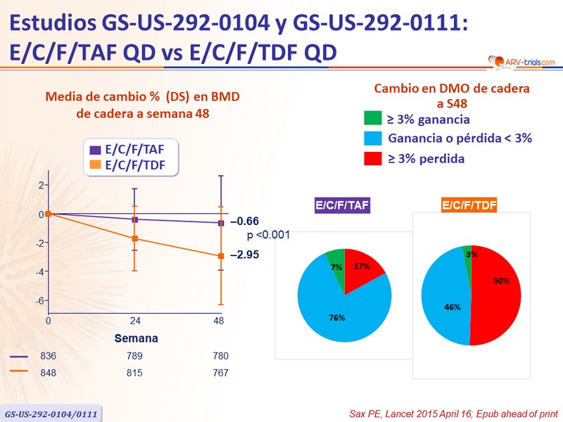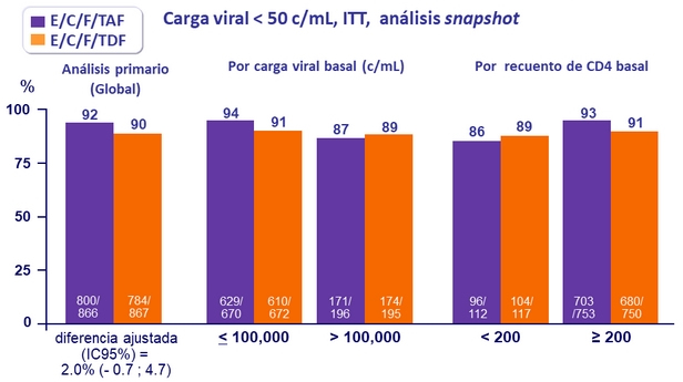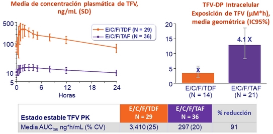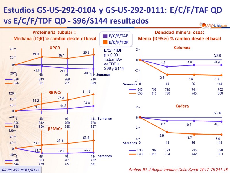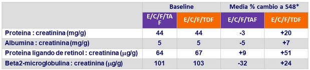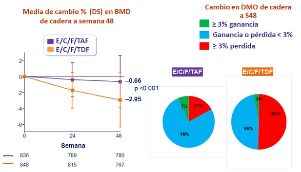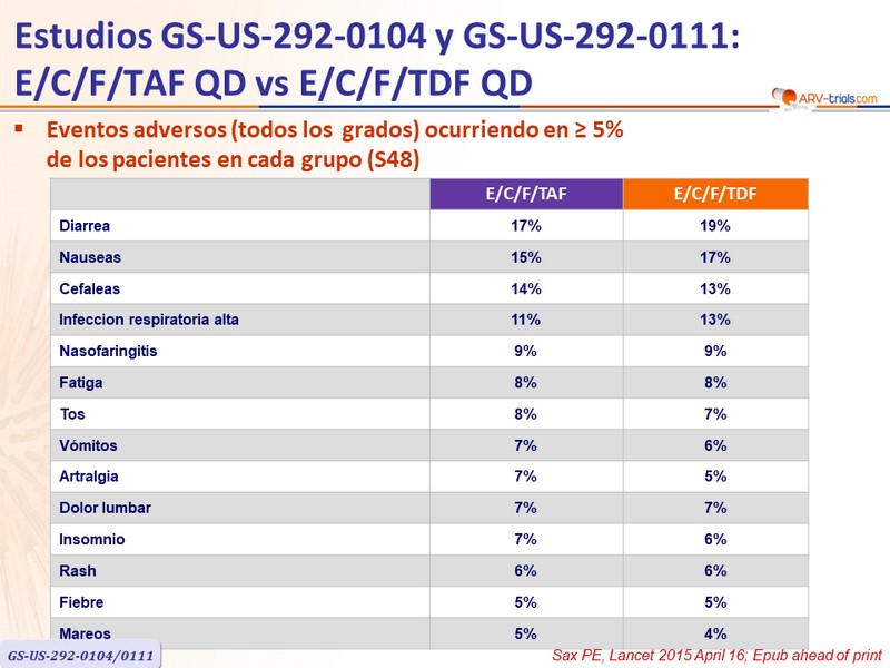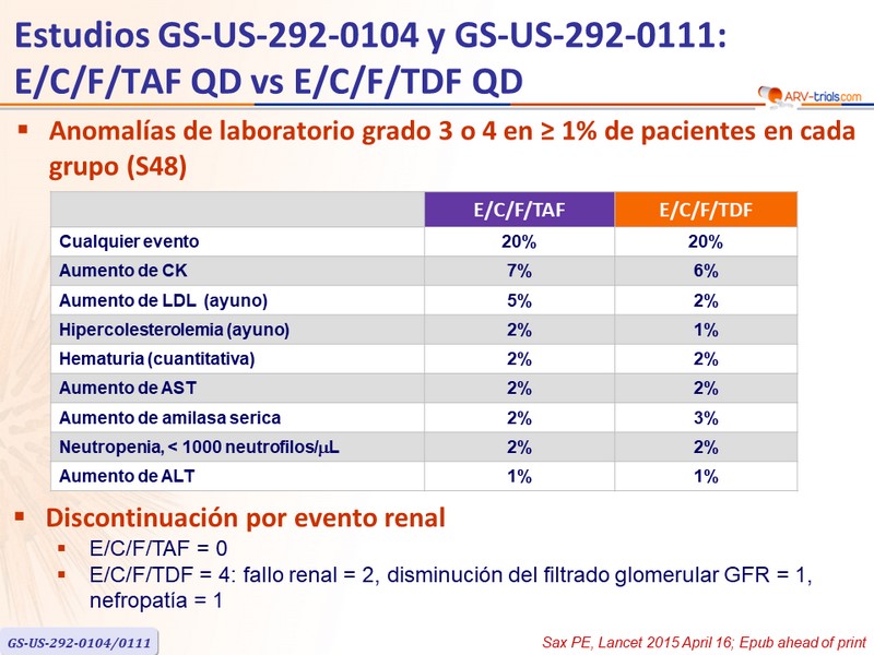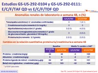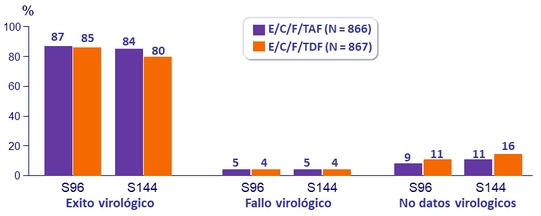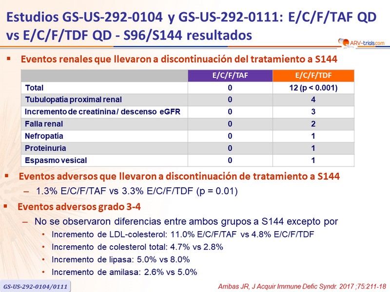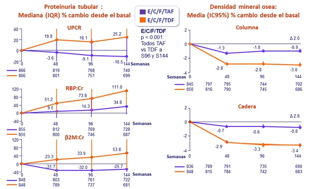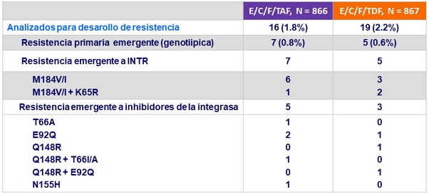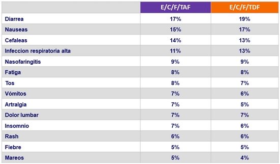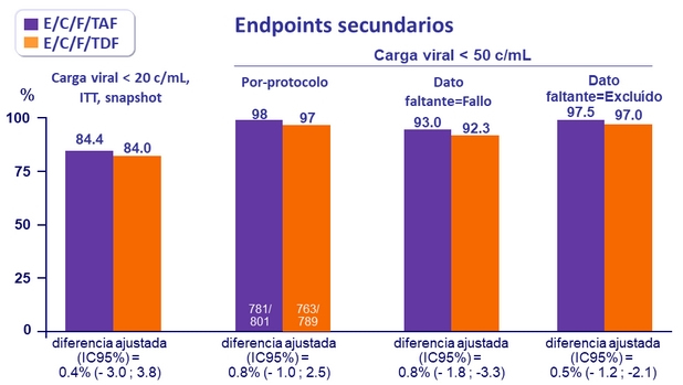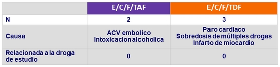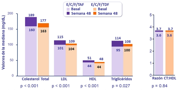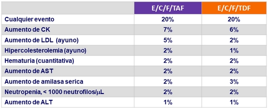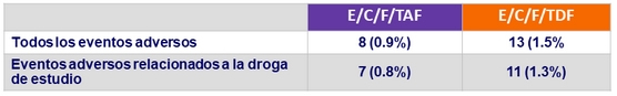 - Incremento de LDL-colesterol: 11.0% E/C/F/TAF vs 4.8% E/C/F/TDF