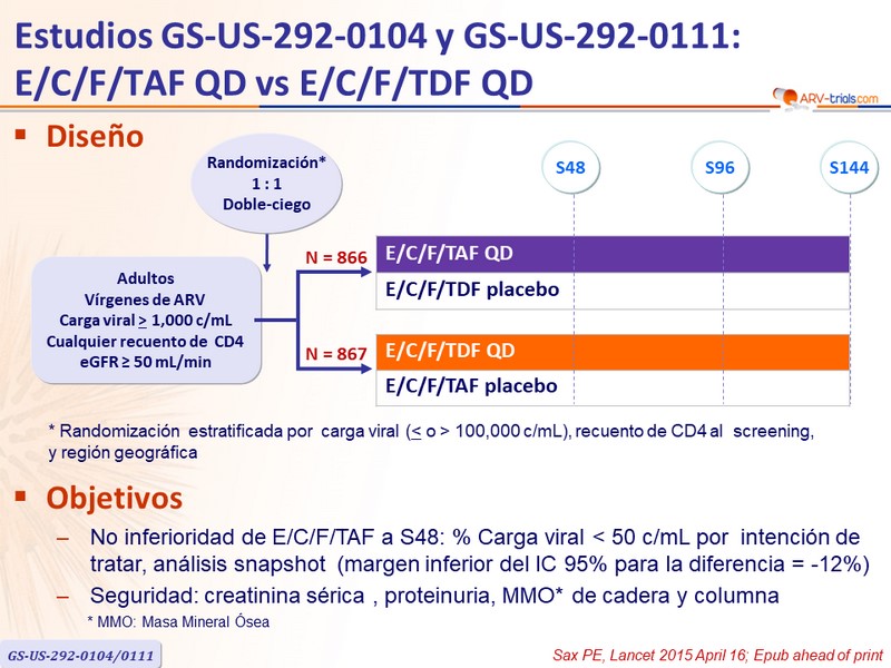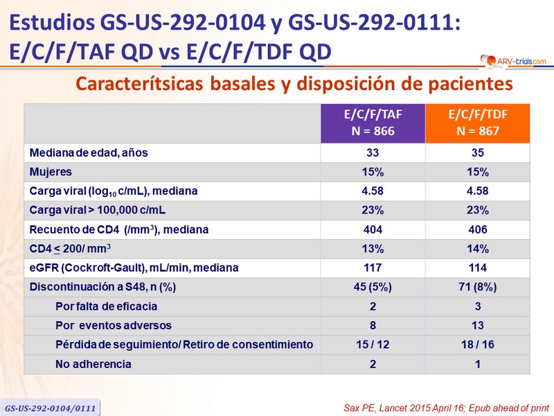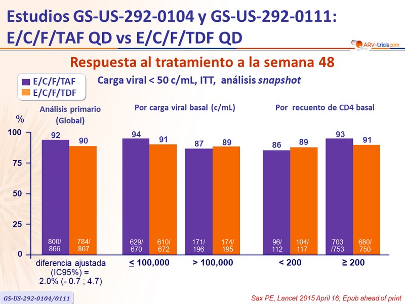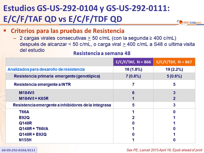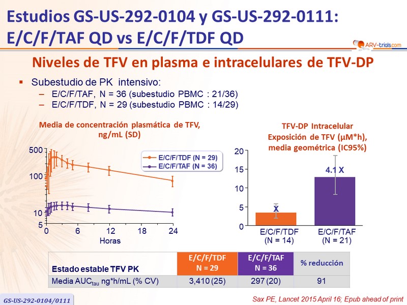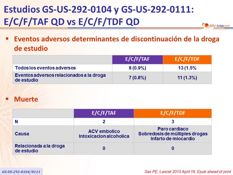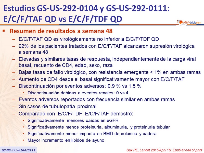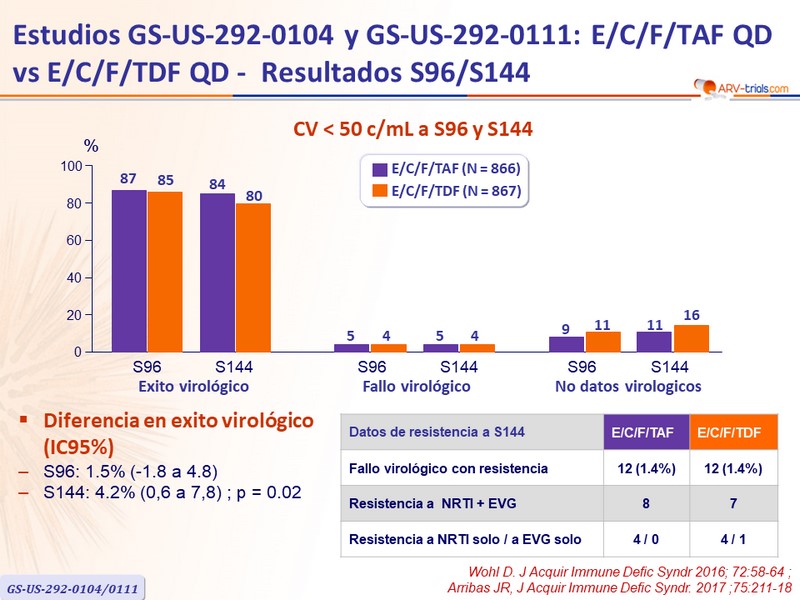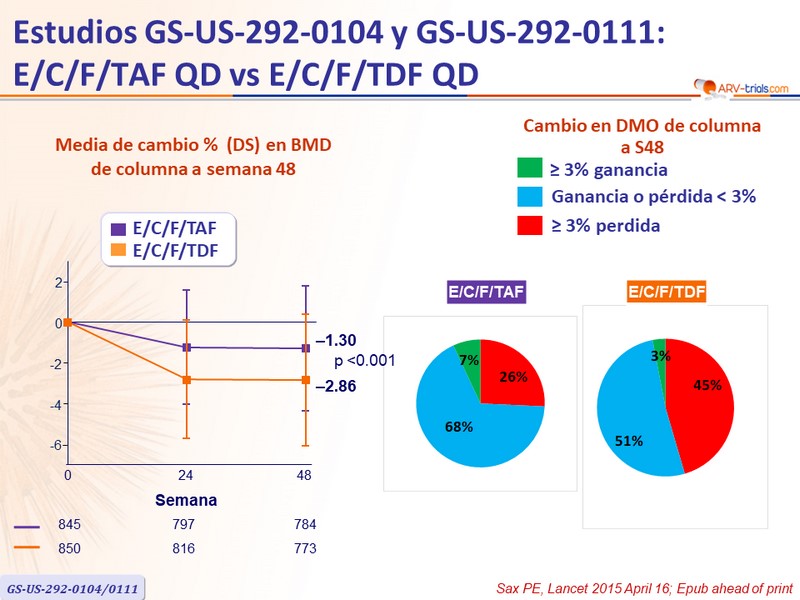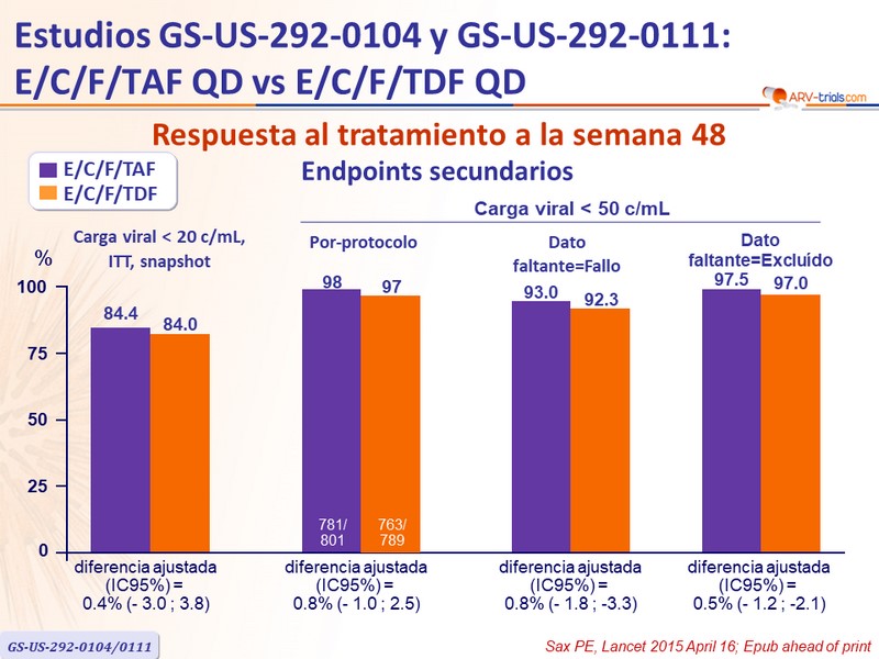 - Incremento de LDL-colesterol: 11.0% E/C/F/TAF vs 4.8% E/C/F/TDF
