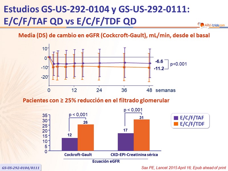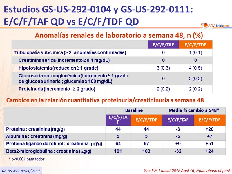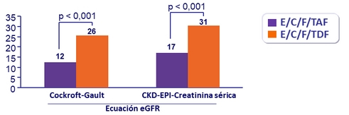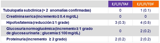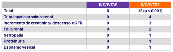 - E/C/F/TDF = 4: fallo renal = 2, disminución del filtrado glomerular GFR = 1, nefropatía = 1