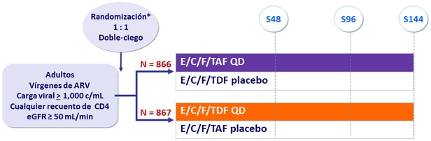 Randomización estratificada por carga viral ( ≤ o > 100,000 c/ mL ), recuento de CD4 al screening ,