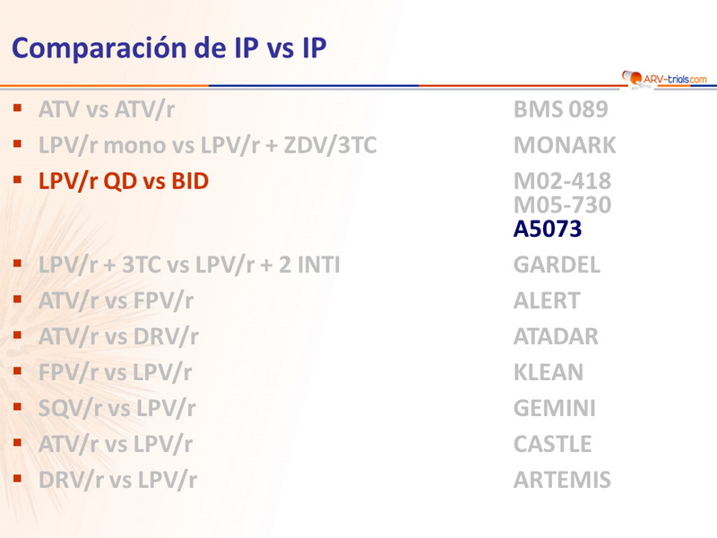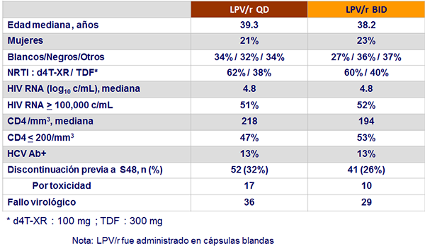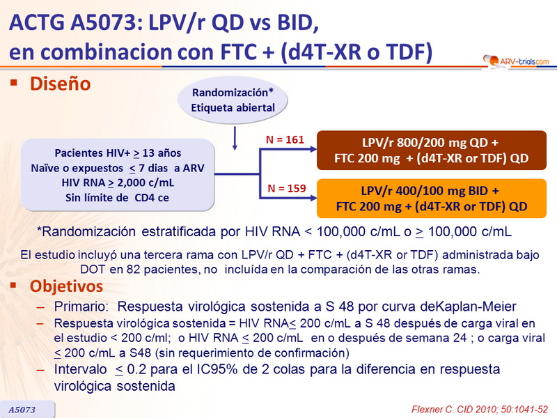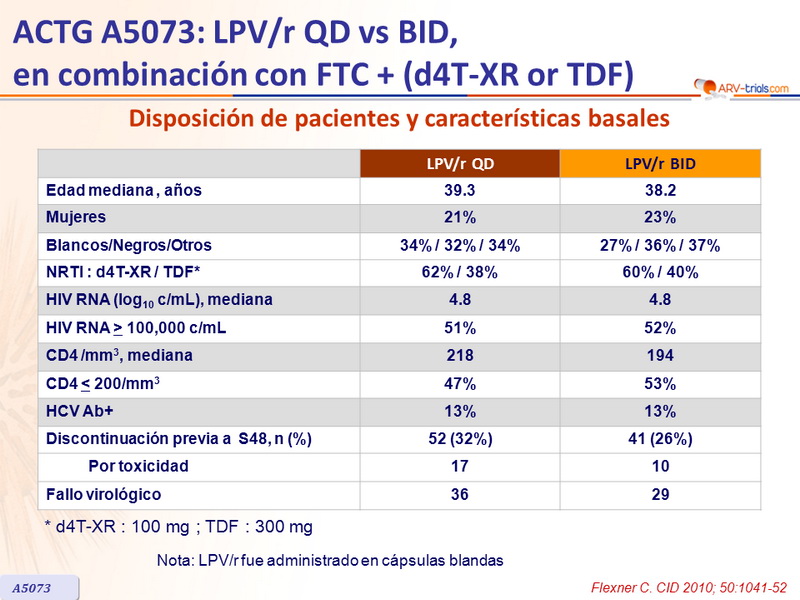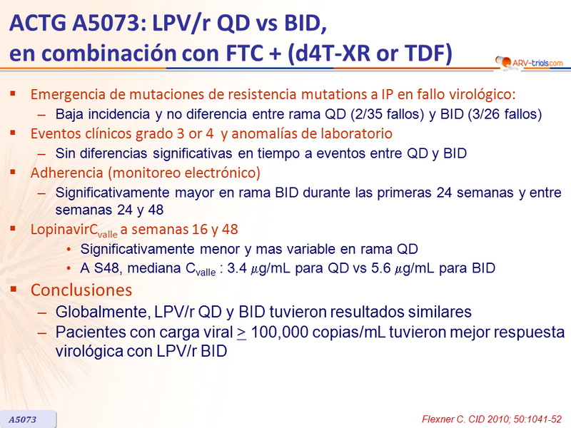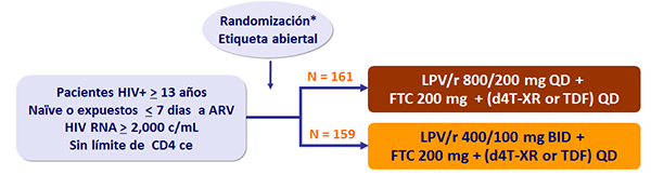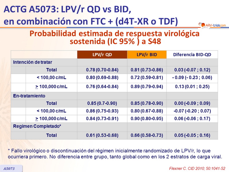 ACTG A5073: LPV/r QD vs BID,en combinacion con FTC + (d4T-XR o TDF)