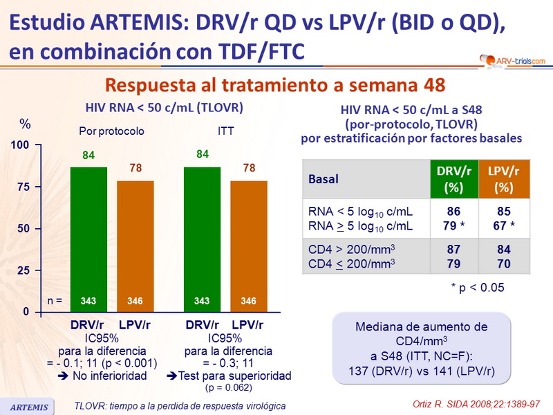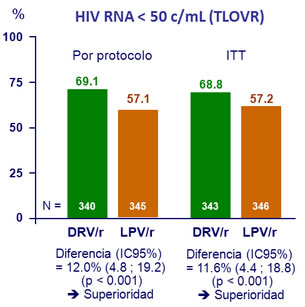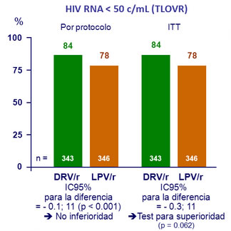 - No inferioridad de DRV/r vs LPV/r a S48: % HIV RNA < 50 c/mL por análisis TLOVR por protocolo (margen inferior del IC95% de 2 colas para la diferencia= - 12%, poder= 90%). Superioridad testeada por ITT si la no inferioridad fuera establecida