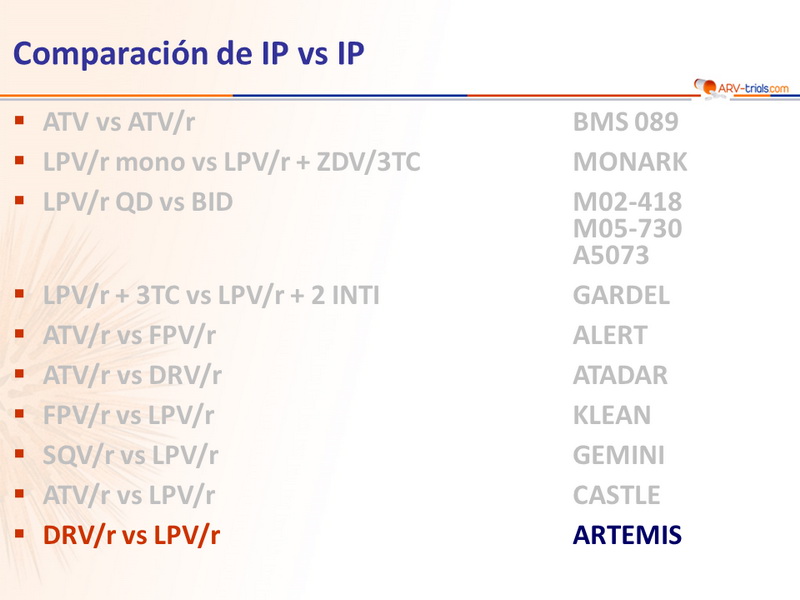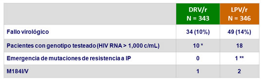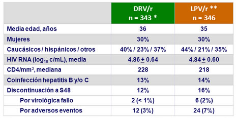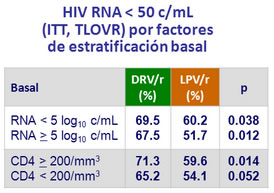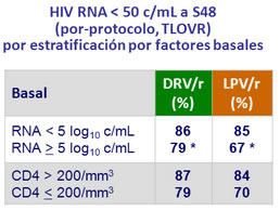 - Mayor respuesta virológica, a S48 (HIV RNA < 50 c/mL) con DRV/rcomparado con LPV/r en pacientes con alta CV pretratamiento (diferencia significativa) o bajo recuento de CD4