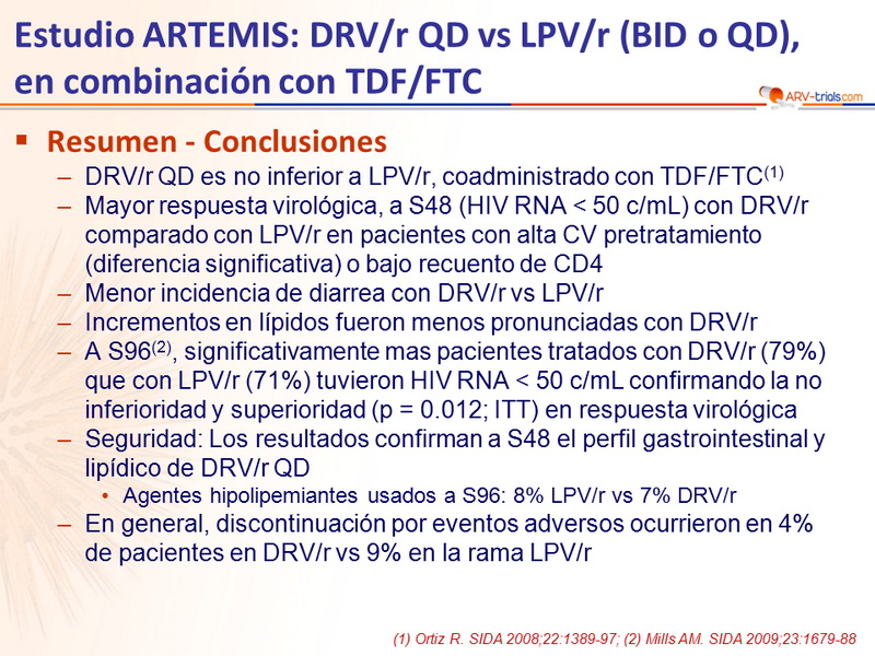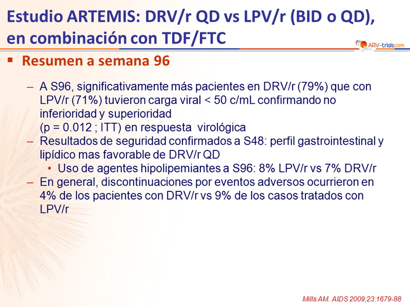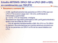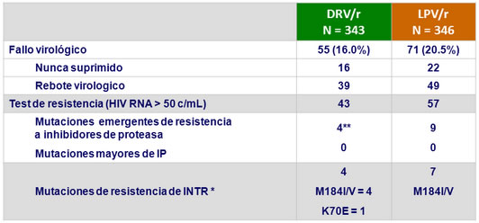 - A S96, significativamente más pacientes en DRV/r (79%) que con LPV/r (71%) tuvieron carga viral < 50 c/mL confirmando no inferioridad y superioridad(p = 0.012 ; ITT) en respuesta virológica