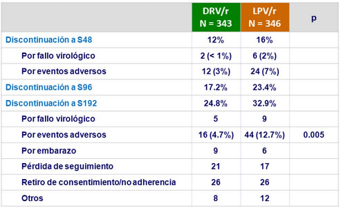 - En general, discontinuación por eventos adversos ocurrieron en 4%de pacientes en DRV/r vs 9% en la rama LPV/r