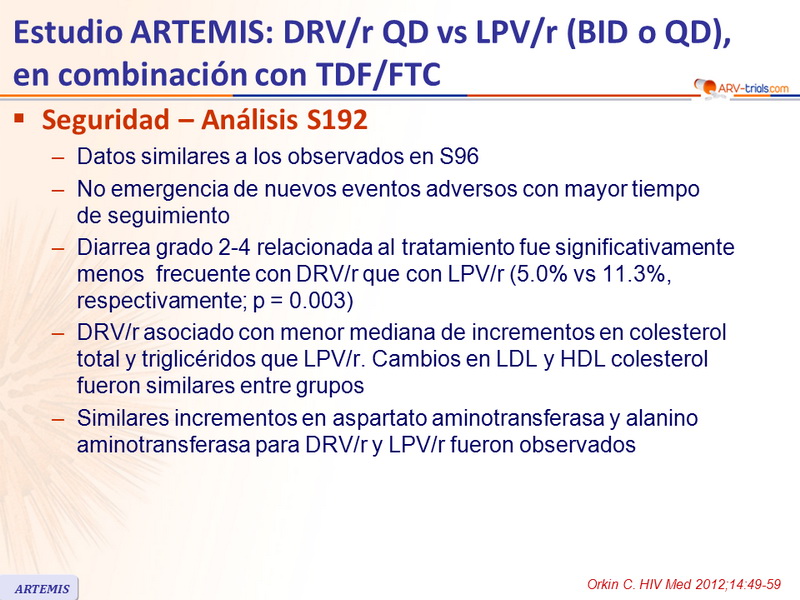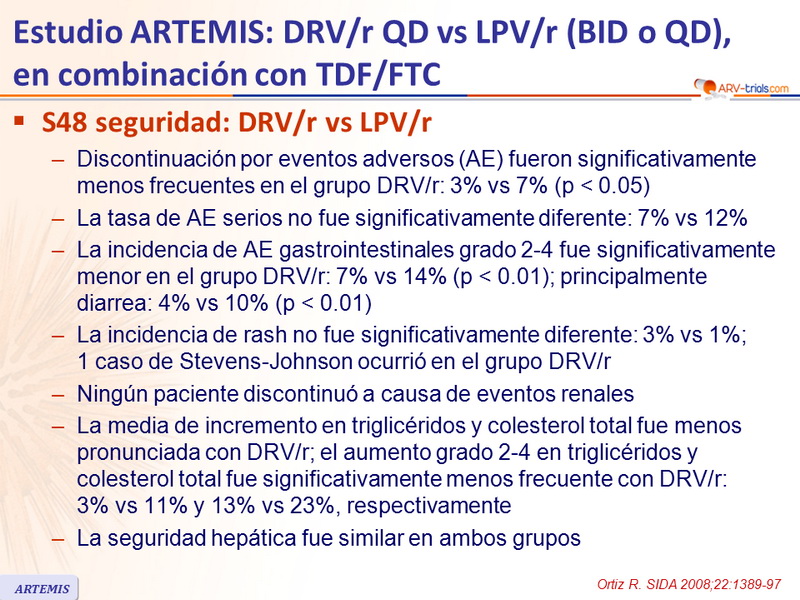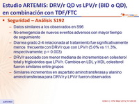 - DRV/r asociado con menor mediana de incrementos en colesterol total y triglicéridos que LPV/r. Cambios en LDL y HDL colesterol fueron similares entre grupos